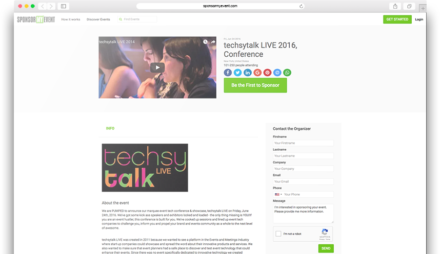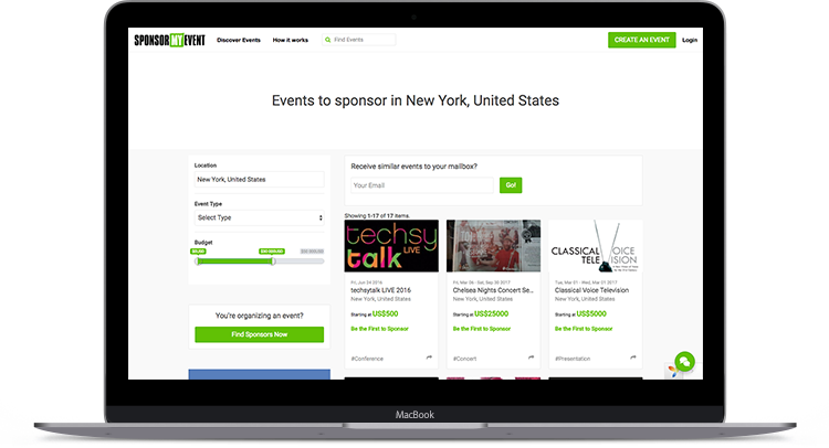 Our platform is home to the entire process of sponsorship from discovery to secure payment. We have built-in messaging, negotiation and deal tracking so that you can manage one or multiple deals. Your privacy is protected and only sponsors can initiate negotiations with organizers.