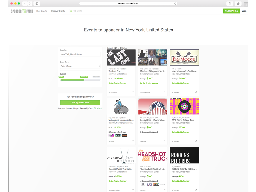 Search thousands of events and filter by event category, location, budget and keywords. Each event has a digital prospectus with information about the event and provides instant access to sponsorship offerings and pricing.
